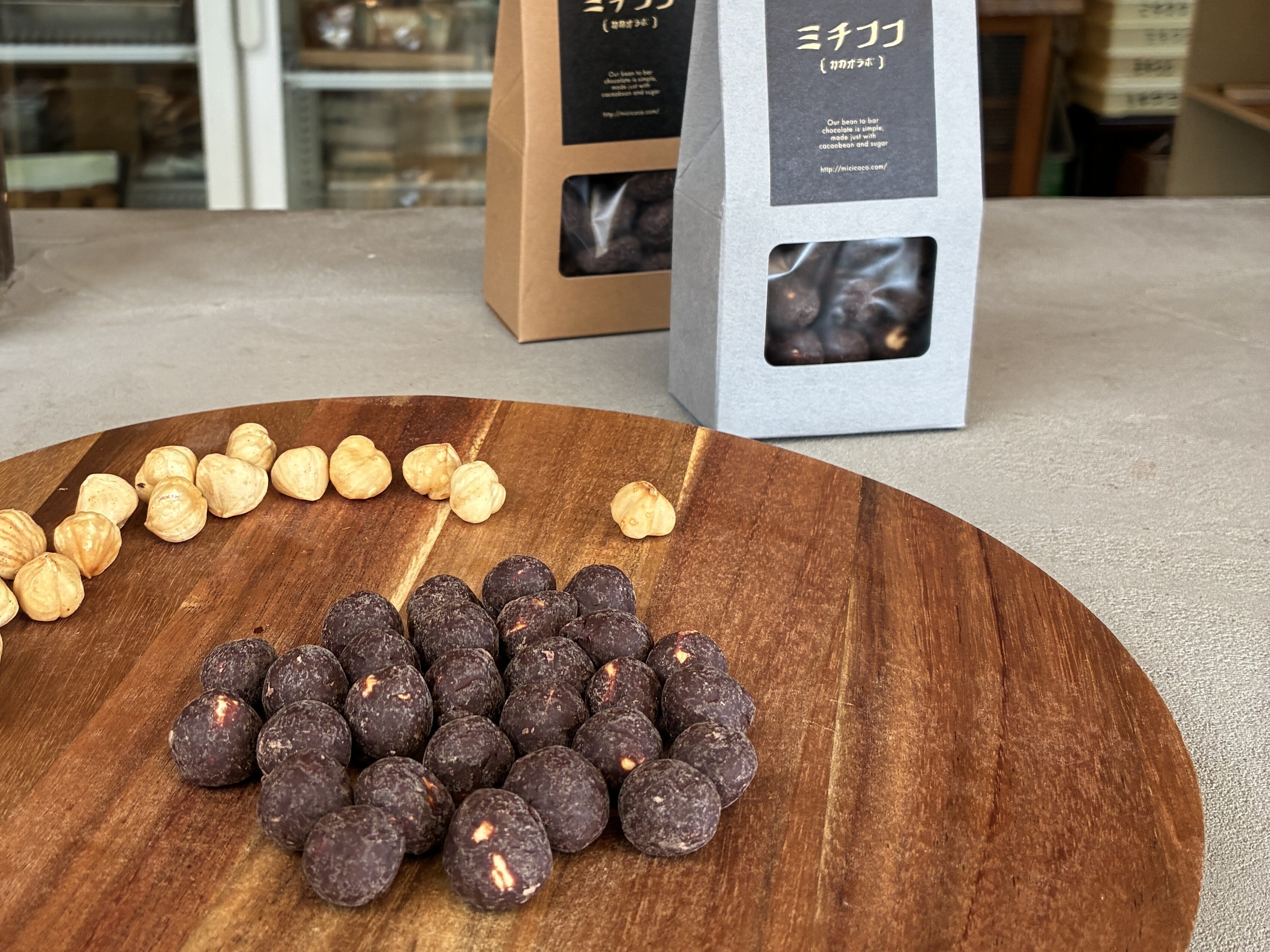 ヘーゼルナッツをローストし、Bean to barチョコレートでコーティングしています。